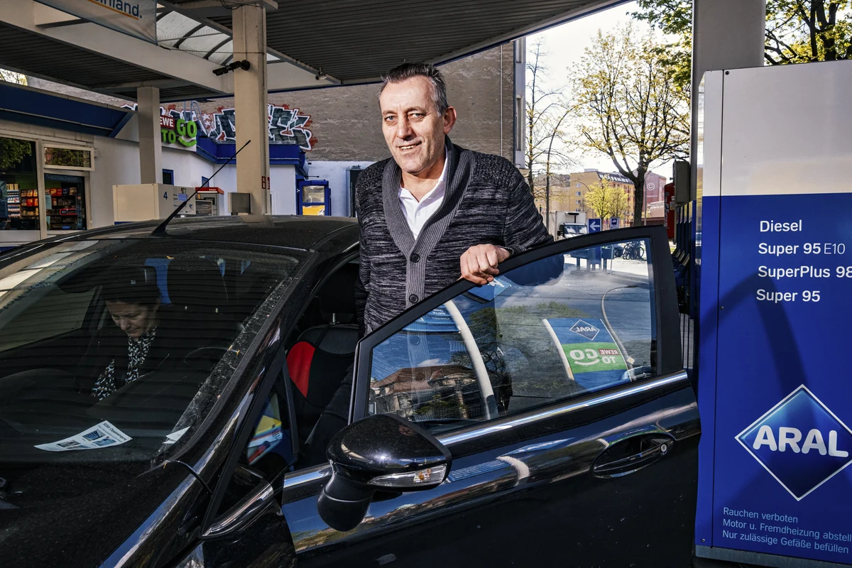 Alili Safi ist 52 Jahre alt, kurz vor 12 Uhr betankt er noch schnell seinen Kleinwagen. Auf dem Beifahrersitz wartet seine Frau, auf dem Rücksitz liegen Putzmittel. Sie betreiben eine Reinigungsfirma, er hat einen zweiten Job als Pizzabäcker. Wenn man nicht vom Staat leben wolle, müsse man sich anstrengen, sagt Safi. Er ist vor 35 Jahren aus Nordmazedonien gekommen. Safi regt sich über die Spritpreise auf.