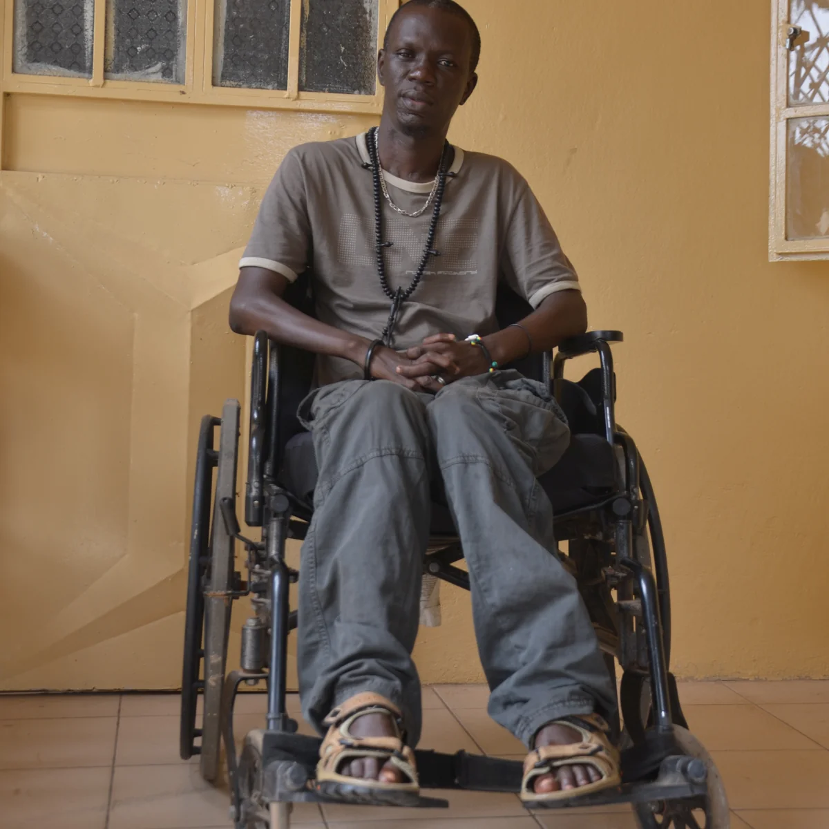 Die Welt von Yusufa Mbaye ist nur wenige Quadratmeter groß und von Mauern umgeben. Egal, ob er im Haus seiner Eltern im Wohnzimmer oder auf der Terrasse sitzt: Der 34-jährige hagere Mann starrt auf hohe Wände und manchmal auch auf den Fernseher. Seit mehr als 17 Jahren sitzt Mbaye im Rollstuhl und kann das Eingangstor nur durchqueren, wenn seine Schwester oder die Mutter helfen. Schon im Haus machen ihm Bewegungen zu schaffen. Der Händedruck ist schlaff.