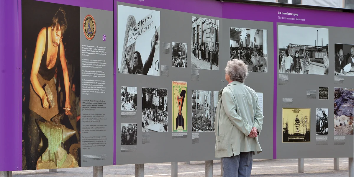 Die Ausstellung, das sind vor allem Tafeln mit Fotos und Videos. Auf rund 1.300 Quadratmetern erinnern diese an die Anfänge des Protests in der DDR, an verschiedene Persönlichkeiten der Revolution und an den Mauerfall selbst. Sie ist täglich rund um die Uhr geöffnet, der Eintritt ist frei. Es gibt immer wieder die Möglichkeit, bei Zeitzeugenführungen mitzumachen, bei denen ehemalige DDR-Bürger*innen von ihren Erlebnissen berichten.