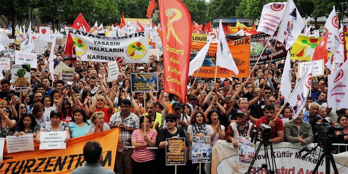 KÖLN taz | Ein einziges Fahnenmeer ergießt sich über den Kölner Heumarkt. Der Platz vor dem Reiterstandbild des Preußenkönigs Friedrich Wilhelm III. ist überfüllt. Doch immer noch strömen die Menschen zu der Großkundgebung der Alevitischen Gemeinde Deutschlands (AABF). Mit 30.000 Teilnehmerinnen und Teilnehmer hat der Veranstalter gerechnet. Doch es sind weit mehr. „Tayyip, istifa!“, skandiert die Menge: „Tayyip, tritt zurück!“