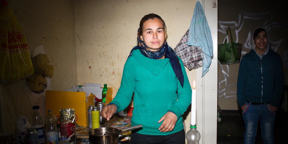 Zusammen mit anderen Verwandten leben die zwei auf einem Gelände in Berlin, das sie „Părăseală“ – Verlassenheit nennen. Es ist ein leerstehendes Haus. Durch ein Loch in der Wand zwängen sie sich hinein, denn Haustür und Fenster sind zugemauert. Der graffitibeschmierte Flur ist lang und dunkel. Bogdan geht mit der Taschenlampe voran. In drei Zimmern leben 30 Personen. Ohne Strom, ohne Wasser. Kerzen sind die einzige Beleuchtung. Eine Packung kostet zwei Euro und reicht für zwei Tage. Mit einer Gasflaschenheizung heizen sie. Es ist warm, doch der Zigarettenrauch und der Geruch nach gekochtem Essen machen die Luft beißend und stickig. „Hier ist es nicht wie in der Wohnung“, sagt Puiu, ein Freund von Bogdan, der auch da wohnt. „Wirf die Kippe auf den Boden. Claudia fegt. Sonst hat sie nichts zu tun.“ Claudia lächelt, lässt die Lider sinken.