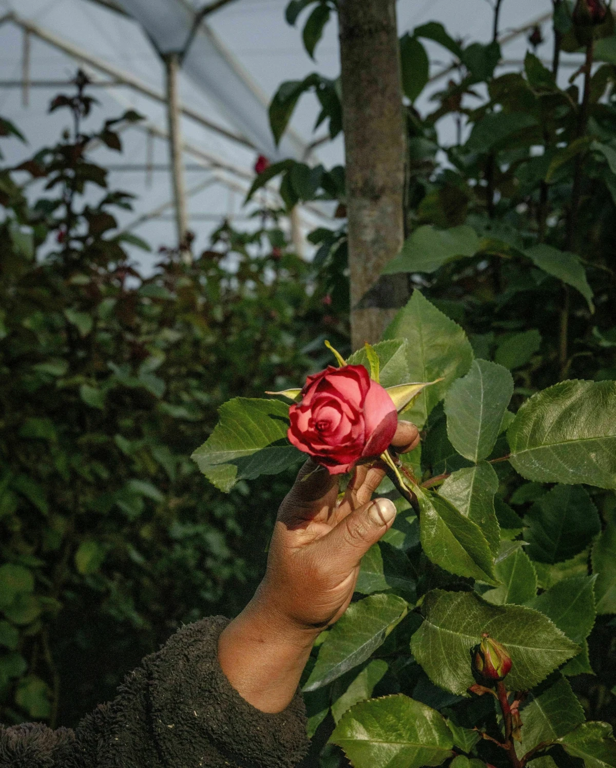 Der Vorgesetzte, der durch die Räume führt, schwärmt von den Blüten der Bestseller „Pink Amaretto“ und „Violet Hill“. Eine Reklame unter dem Hallendach verspricht „Four Seasons Quality“. „Die ganzjährige Produktion macht unsere Rosen klimafreundlicher als solche, die während der kalten Wintermonate in energiefressenden Gewächshäusern in den Niederlanden gezüchtet werden“, sagt der Mann.