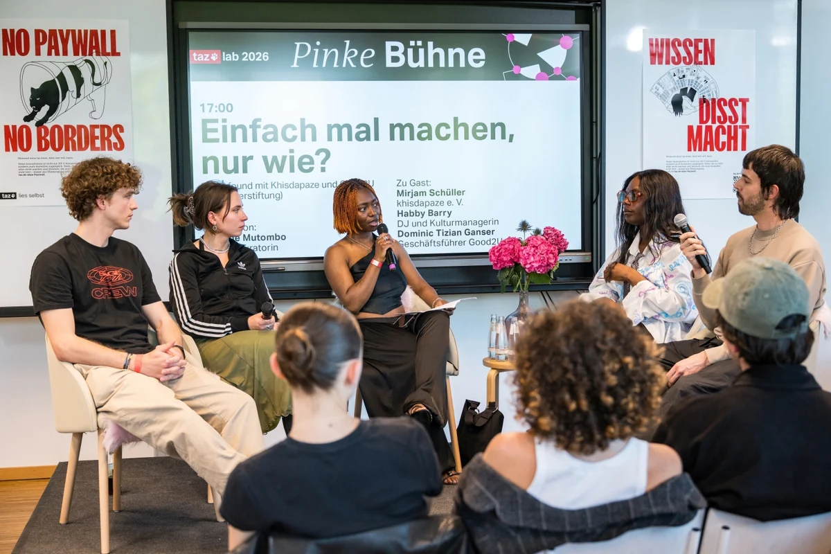 Oder die pinken Bühnen der taz-Genossenschaft, die durchweg (erfolgreich) Angebote für das sehr junge Publikum machte – Tacheles wurde auch hier, etwa zu Fragen eines Dienstes in der Bundeswehr, geredet: Der Ton machte auch hier die Musik, man anerkannte füreinander, wirklich gegensätzlicher Auffassung zu sein, doch dies in freundlich bleibender Sprechfähigkeit.