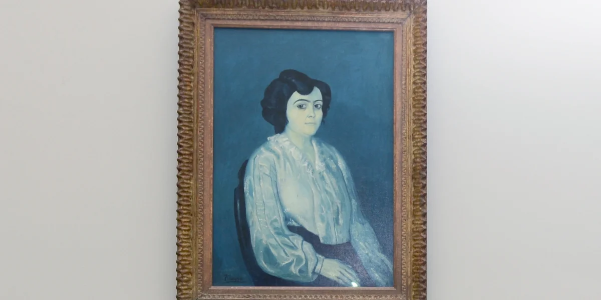 In München sitzt eine Dame mit geschlossenem Mund auf einem Stuhl, die Augen sind auf den Betrachter gerichtet, die Haare schwarz wie die Nacht. Es handelt sich um die Gattin des Schneiders Benet Soler, eines Freundes von Pablo Picasso. Picasso schuf das Bild 1903.