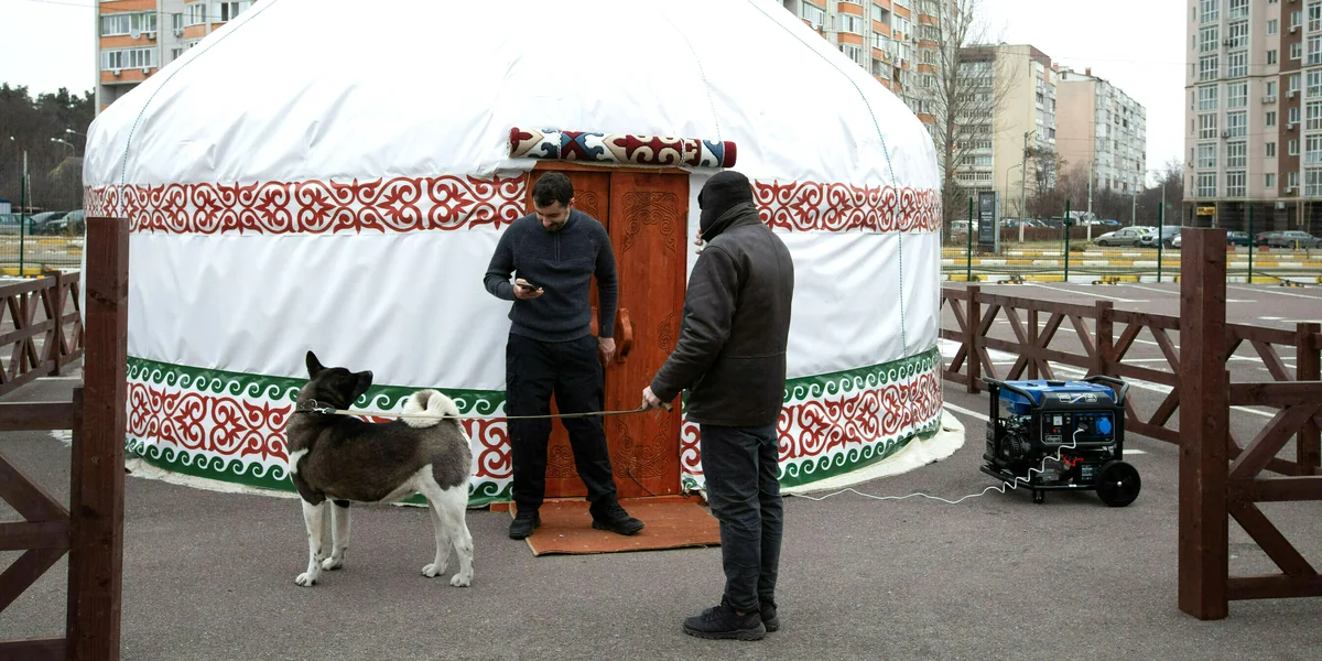 Eine Jurte ist eine traditionelle Behausung der Steppenkasachen, ein Synonym für Schutz und Wohlstand. In der Ukraine erfüllt das von Kasachen übergebene Exemplar genau diese Funktion: Dort kann man sich aufwärmen, Telefone aufladen, Tee trinken – im Allgemeinen wirkt diese Geste eher symbolisch, aber dennoch schön.