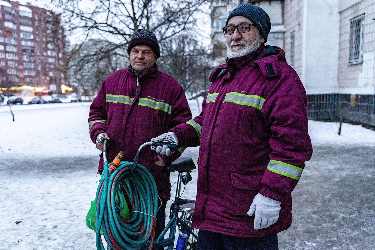 Sie beginnen um fünf Uhr morgens und laufen täglich Tausende Treppenstufen hinauf und hinunter. Die Aufzüge sind außer Betrieb, die Anrufe reißen nicht ab. Die Kälte verschlimmert die Lage nur noch – häufig kommt es zu Unfällen. Ständig müsse man in Kellern oder unter Dächern herumkriechen, die Rohre mit Heizmatten erwärmen und geplatzte Rohre schweißen oder ersetzen, erklärt Andryj Hruschetskyj, ein Mitarbeiter des Wasserbetriebes.