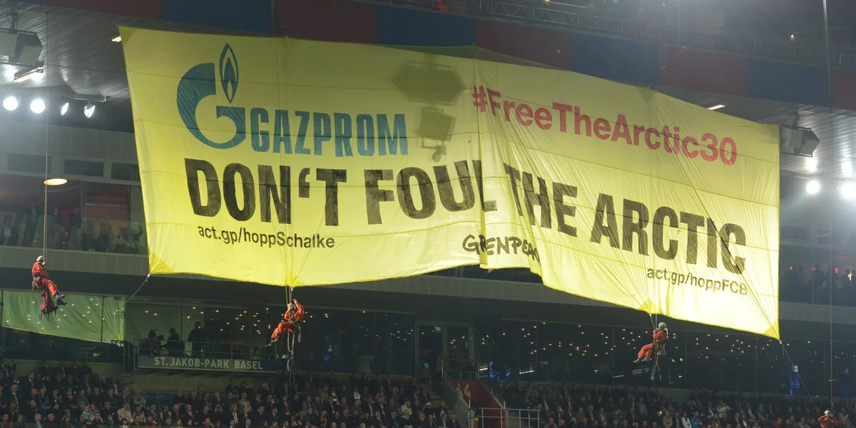 Dass Gazprom aber auch versucht, sich mit Sport-Sponsoring ein positives Image aufzubauen, verschaffte Greenpeace am Dienstag eine willkommene Bühne: Im Champions-League-Spiel des FC Basel gegen den von Gazprom unterstützen deutschen Klub Schalke 04 seilten sich Aktivsten in der fünften Spielminute mit einem riesigen Transparent vom Stadiondach ab. Das Spiel musste kurzfristig unterbrochen werden.
