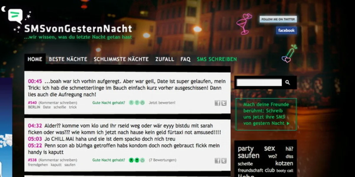 Wer die eigenen oder empfangenen nächtlichen Geistesblitze nicht für sich (und den eigentlichen Empfänger) behalten kann und will, ist auf smsvongesternnacht.de in bester Gesellschaft. Dort findet sich die gesamte Bandbreite der nächtlichen, menschlichen Abgründe – natürlich hauptsächlich von Sex und Alkohol geprägt. Aber auch von tiefen Wahrheiten.