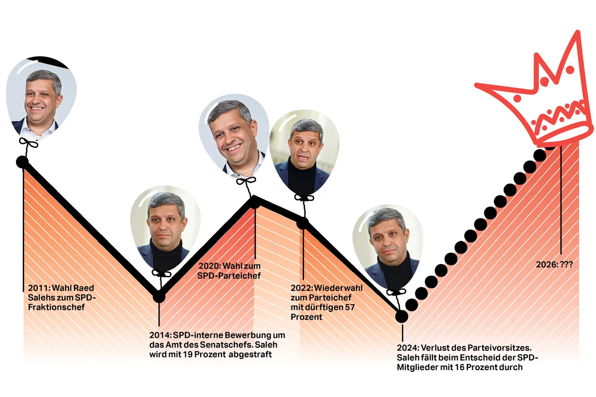 Zur Erinnerung: Raed Saleh wollte schon einmal Regierender Bürgermeister werden. 2014 bewarb er sich parteiintern um die Nachfolge von Senatschef Klaus Wowereit. Auch damals scheiterte er krachend. Weniger als ein Fünftel der Genoss:innen machten ihr Kreuz bei Saleh, den SPD-Mitgliederentscheid gewann der seinerzeitige Stadtentwicklungssenator Michael Müller, der Berlin dann auch bis 2021 regierte.