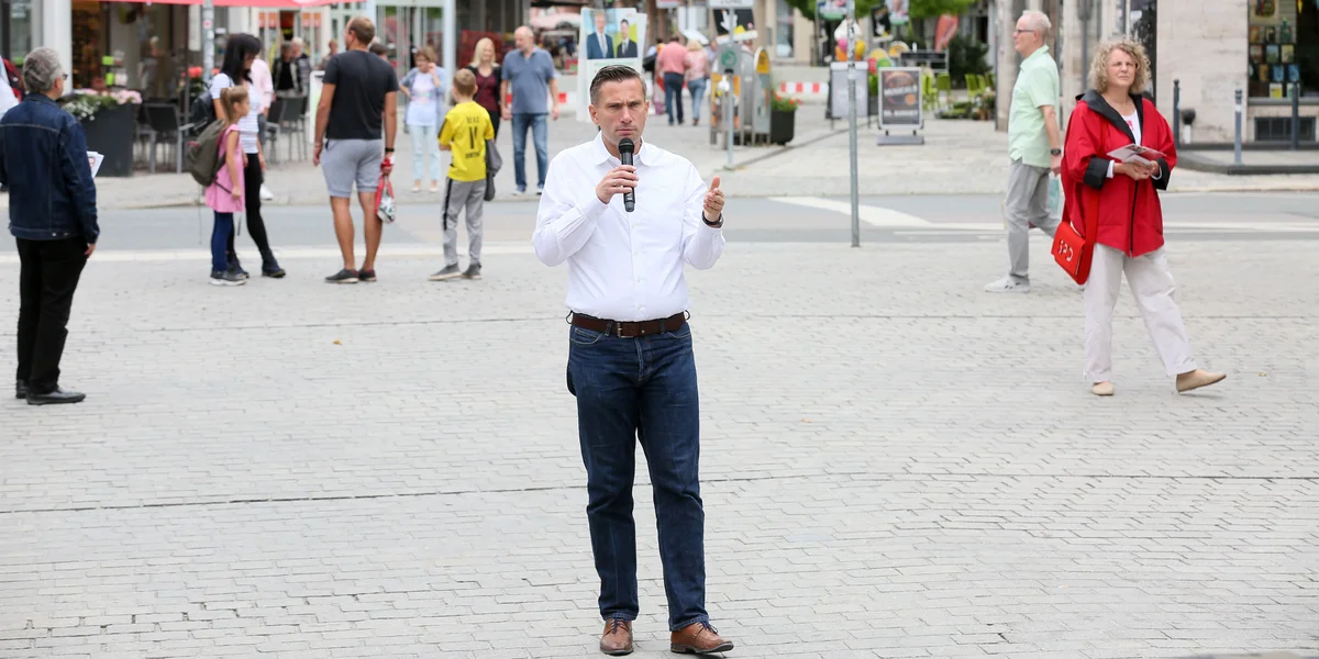 Dulig ist außerdem Wirtschafts- und Verkehrsminister, dazu SPD-Landesvorsitzender. Er läuft auf und ab, während er redet, einfach so ohne Podium und Publikum, seine Stimme verstärkt eine Lautsprecherbox, „Fünf Minuten Dulig“, das Format hat er sich selbst ausgedacht. Ein weißhaariges Paar bleibt stehen, zwei Frauen mit Jacken in gedeckten Farben auch, eine Mutter mit zwei Töchtern schiebt ihr Rad zügig weiter. Schon ist die Rede um. „Vielen Dank, Ihr Martin Dulig.“
