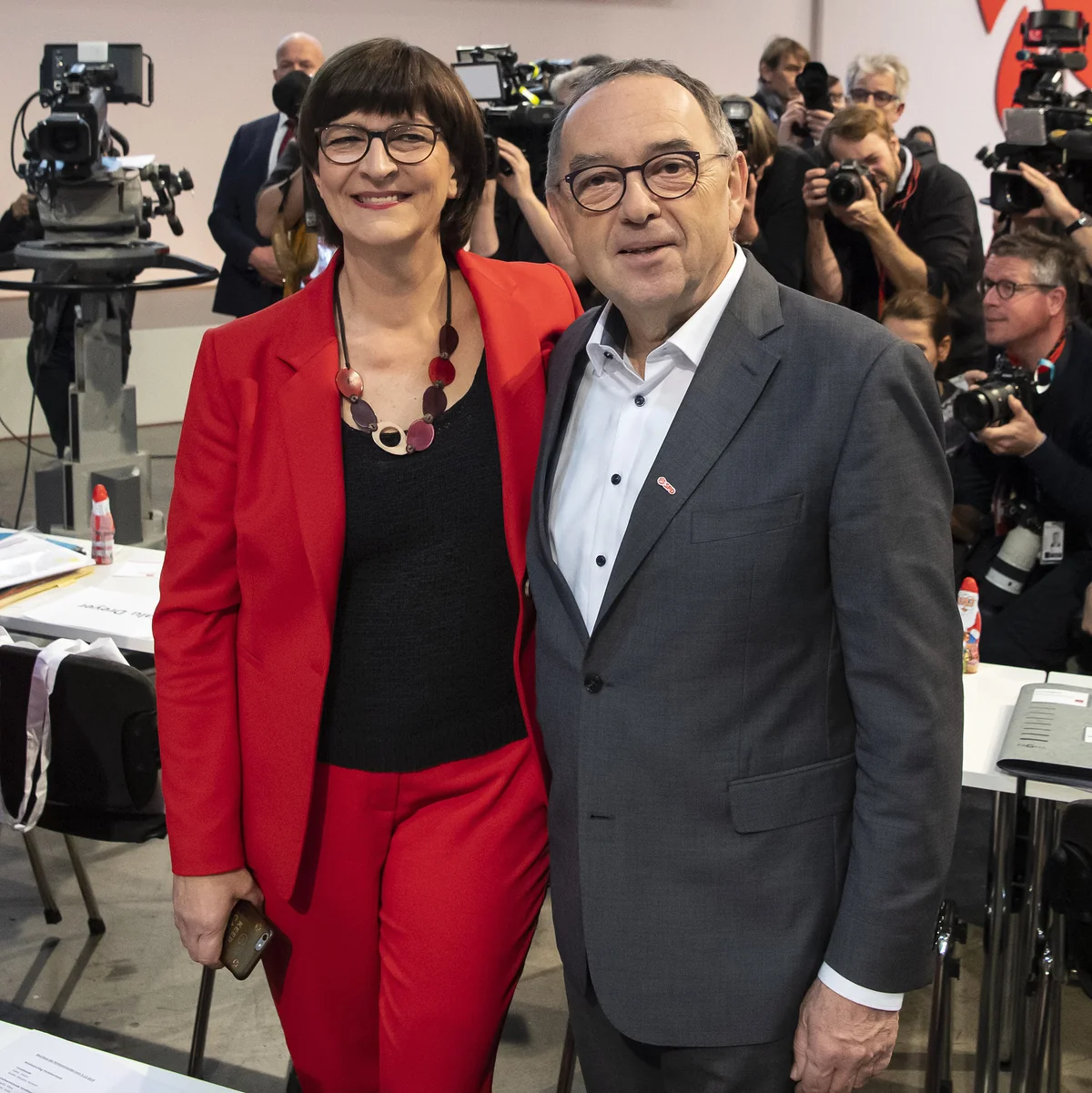Die erste Parteitagsperformance liegt irgendwo dazwischen. Solide und unfallfrei, aber ohne rhetorische Glanzlichter und zündende Visionen. Um kurz vor 15 Uhr kommt das Ergebnis. 75,9 Prozent für Saskia Esken, 89,2 für Norbert Walter-Borjans. Das passt zur Harmonieansage in der CityCube-Messehalle in Berlin. Es ist ein ordentliches Resultat für die linkere, schroffer wirkende Esken, ein blendendes für Walter-Borjans, der wie ein freundlicher, vertrauenerweckender Onkel wirkt. Und die Partei will Mitte, Zusammenhalt, Verständigung.