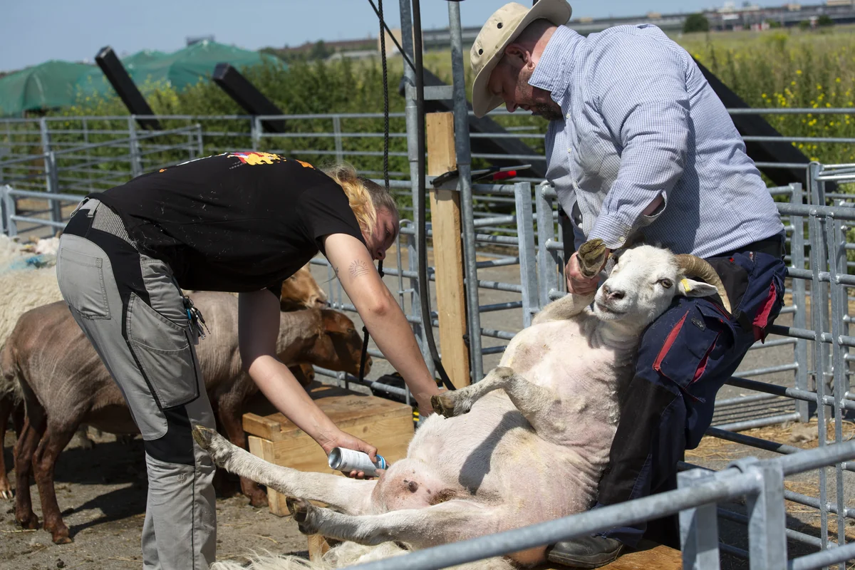 Kleine Herden gibt es außerdem in den Gärten der Welt, im Naturpark Südgelände sowie im Britzer Garten. An jedem Standort gebe es festes Personal, aber, so Wasem: „Ich habe die Oberaufsicht. Schafschur, Mineralstoffversorgung, Impfung, Klauenschnitt, das koordinieren wir von hier.“ Das bedeutet eine Menge Papierkram, zwei Mitarbeiterinnen sitzen dafür im Büro, „wir wiegen, und die Ablammung wird auch dokumentiert“. 52 Lämmer wurden dieses Jahr allein auf dem Tempelhofer Feld geboren.