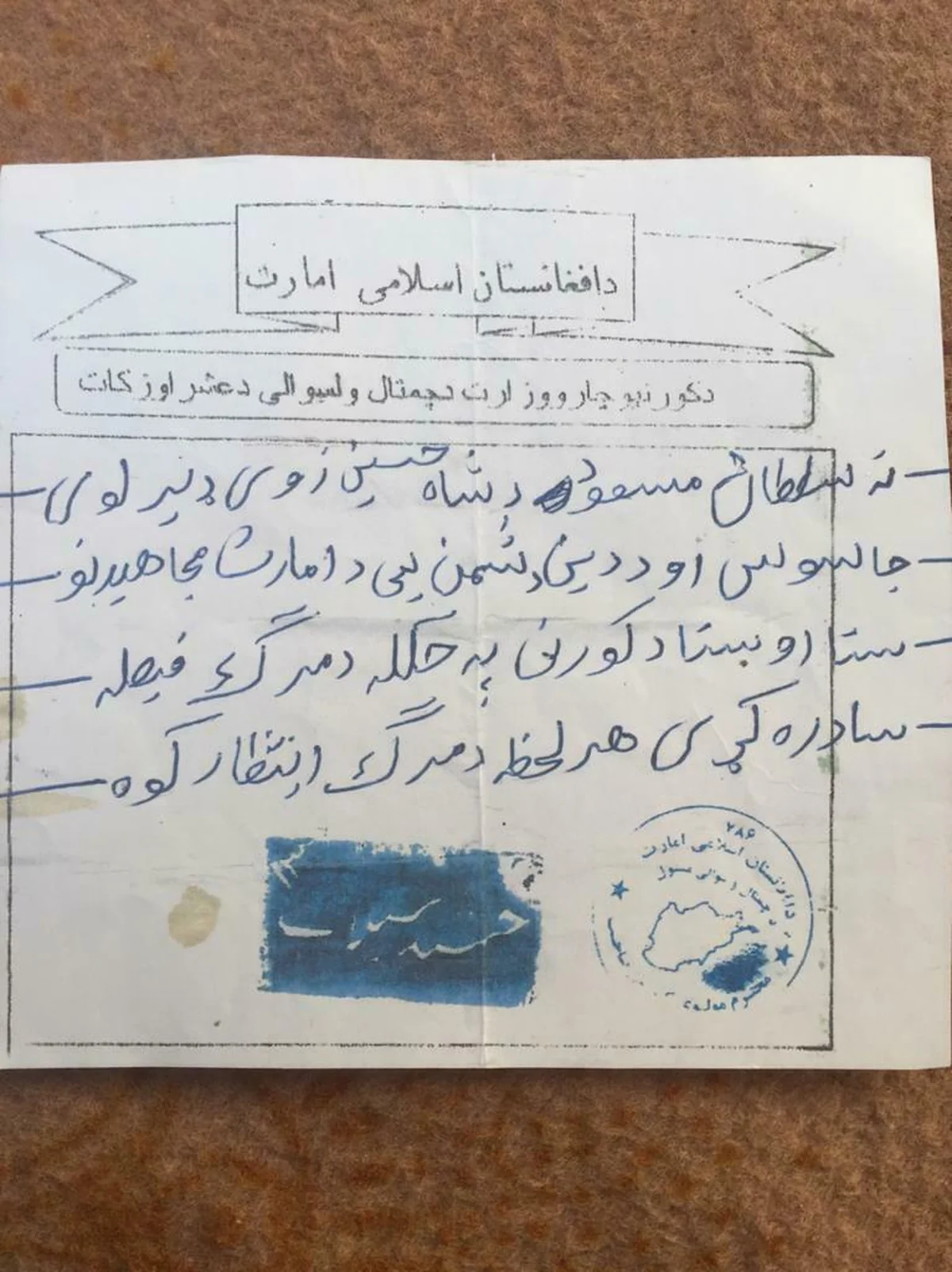 Von den Taliban bekommt er 2014 eine Morddrohung. Auch die trägt er noch mit sich herum und zeigt sie der taz. Handgeschrieben steht dort: „Masoud Azami, du bist ein Spion für die ausländischen Truppen. Wir werden dich töten“ Darunter prangt der Stempel von einem Kommandanten der Taliban. Ein Oberfeldwebel der Bundeswehr hat schriftlich bestätigt, dass es sich um ein Originaldokument handelt.
