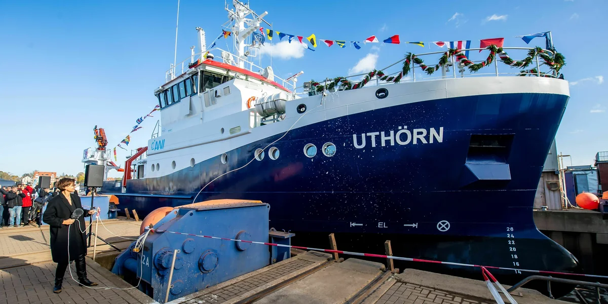 Das erste deutsche Seeschiff, das nicht nur elektrisch, sondern auch mit einem nachhaltigen Methanolantrieb fährt, wurde diese Woche feierlich an der Weser getauft, von Bundesforschungsministerin Bettina Stark-Watzinger (FDP) höchstpersönlich. Gebaut hat es die Fassmer-Werft aus dem kleinen Örtchen Berne, die sonst vor allem Rettungsboote baut, ein Familienbetrieb in fünfter Generation. In Auftrag gegeben hat die „Uthörn II“ das Alfred-Wegener-Institut (AWI) in Bremerhaven, Helmholtz-Zentrum für Polar- und Meeresforschung. Sie ist ein Forschungskutter für die Nordsee.