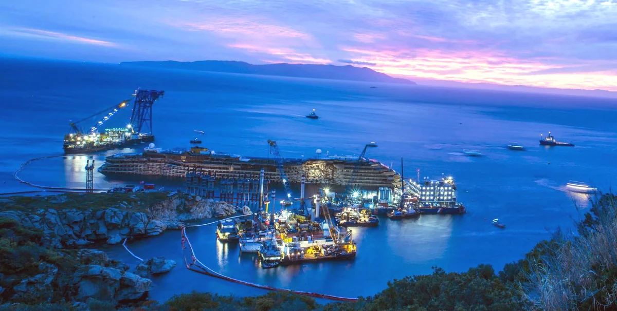 Noch nie ist ein größeres Passagierschiff geborgen worden. Das Wrack des havarierten Kreuzfahrtschiffes Costa Concordia wurde aufgerichtet.