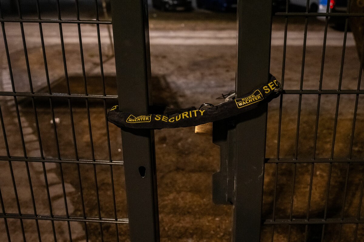 Und dann: Flutlicht an und Bahn frei für den privaten Sicherheitsdienst, der im Auftrag der Senatsumweltverwaltung den Görli verriegeln soll. Von den Demonstrant*innen unbemerkt machen sich die vier Männer in Begleitung eines Schäferhunds und einiger Polizist*innen zunächst an den Toren entlang der Görlitzer Straße zu schaffen. Eins nach dem anderen verschließen sie mit Ketten, die aussehen wie mittelgute Fahrradschlösser. Ob das was bringt, ist mehr als fraglich. Unterhalb einiger Tore ist eine Lücke von geschätzt 40 Zentimetern, darunter durchrobben wäre nicht schwer. Andere Eingänge sind so schlecht gebaut, dass zwischen geschlossenen Torflügeln Lücken bleiben, groß genug, um sich hindurchzuzwängen. Ob der Zaun die zwei Millionen Euro wert ist?