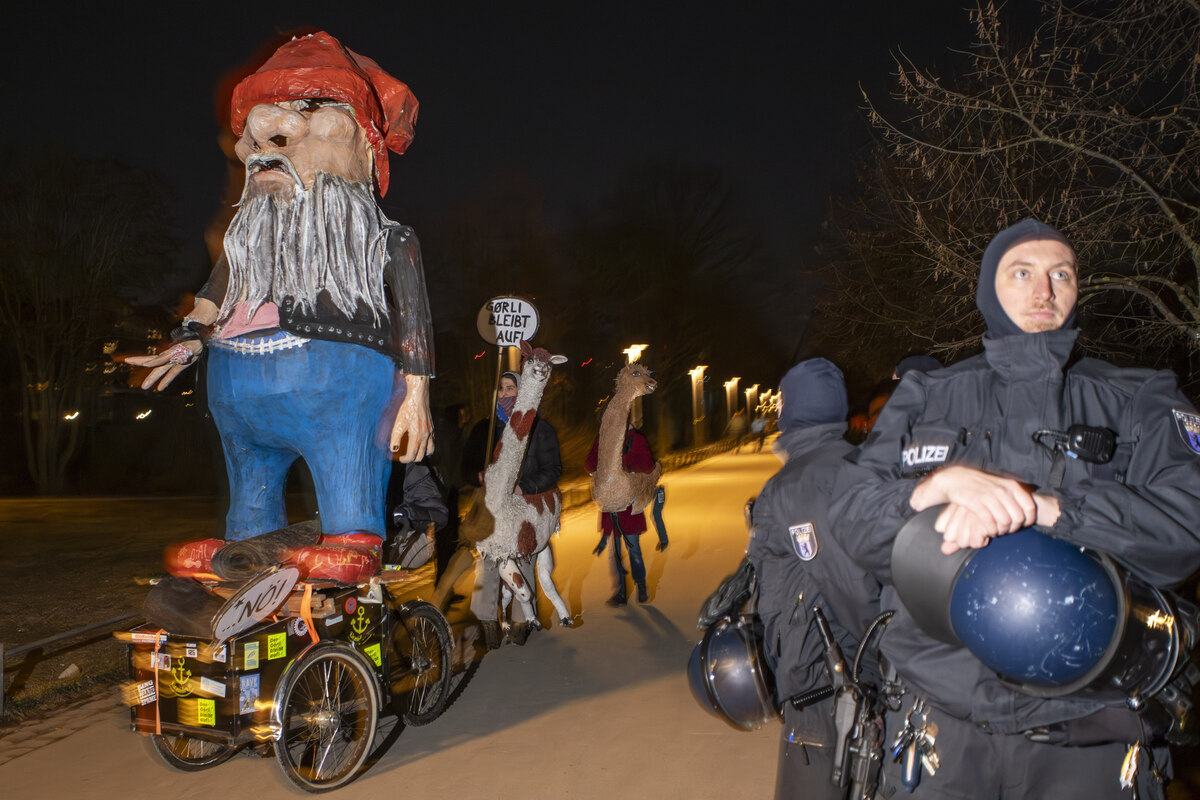 Drinnen sind da noch um die 200 Menschen. Junge Leute mit Kufija, alte Kreuzberger Punks, einige haben ordentlich einen sitzen, andere kicken einen Fußball herum. Der riesige Kai-Wegner-Gartenzwerg aus Pappmaché ist auch da, begleitet von Demonstrant*innen in Lama-Figuren, einer hat sich in einen knallorangenen, überlebensgroßen BSR-Mülleimer gezwängt. „Darf ich mal kurz durch?“, fragt ein Anwohner auf seinem Plakat.