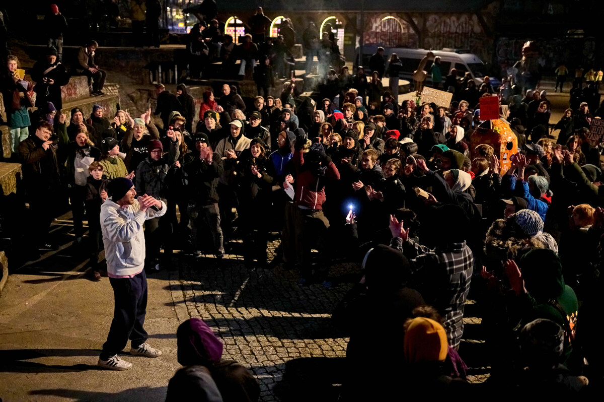 Im Licht des Beinahe-Vollmonds und der neuen Parkbeleuchtung versammeln sich am Sonntag bis zu 500 Menschen zwischen Lokschuppen und ehemaligen Pamukkale-Brunnen. Der Platz wirkt wie ein Amphitheater, etwas erhöht steht ein kleines Zelt. Von dort muss Ari verkünden, dass der Hauptredner des Abends, der Linken-Bundestagsabgeordnete Ferat Koçak, leider krank geworden sei. Zum Glück aber sei der Rapper Sero hier, „der praktikumsmäßig bei Ferat im Bundestag arbeitet und dessen Redebeitrag jetzt a cappella rappt.“