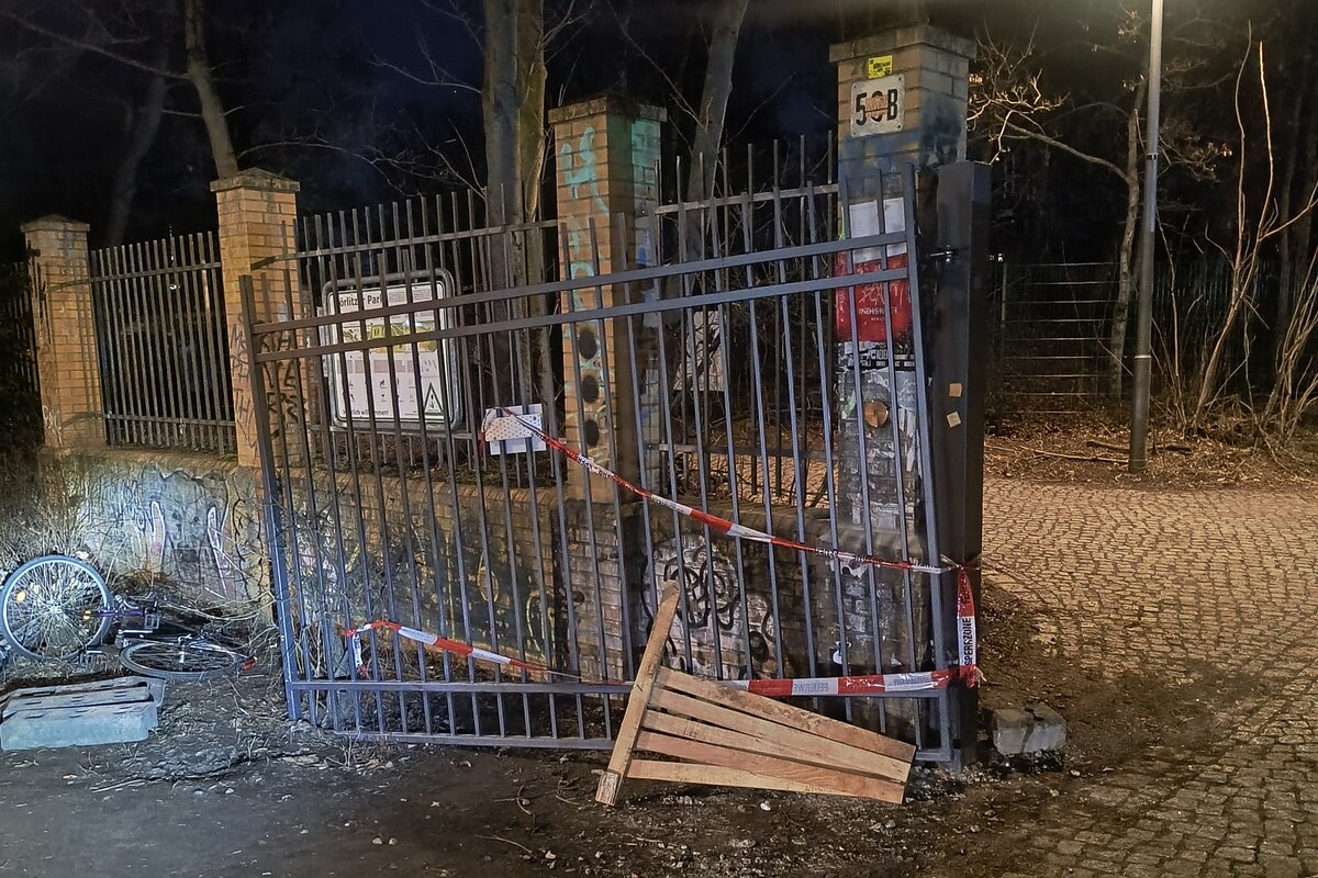 Doch jetzt ist der Zaun erst einmal da – hat aber laut der Gruppe „Görli 24/7 “ den ein oder anderen Konstruktionsfehler. „Viele Bauwerke im Görli sehen stabiler, aus als sie es sind, andere sehen instabil aus und sind es auch“, berichtet ein Redner der Menge. Ihm liege aber nichts ferner, als zu Straftaten aufzurufen. Muss er auch gar nicht: Zwei Nächte zuvor wurden gleich mehrere Eingänge beschädigt. Ein Tor in Richtung Glogauer Straße wurde dabei so aus den Angeln gehoben, dass es seiner Funktion beraubt ist. Am Sonntagabend ist es mit rot-weißem Absperrband umwickelt und von Polizist*innen bewacht.