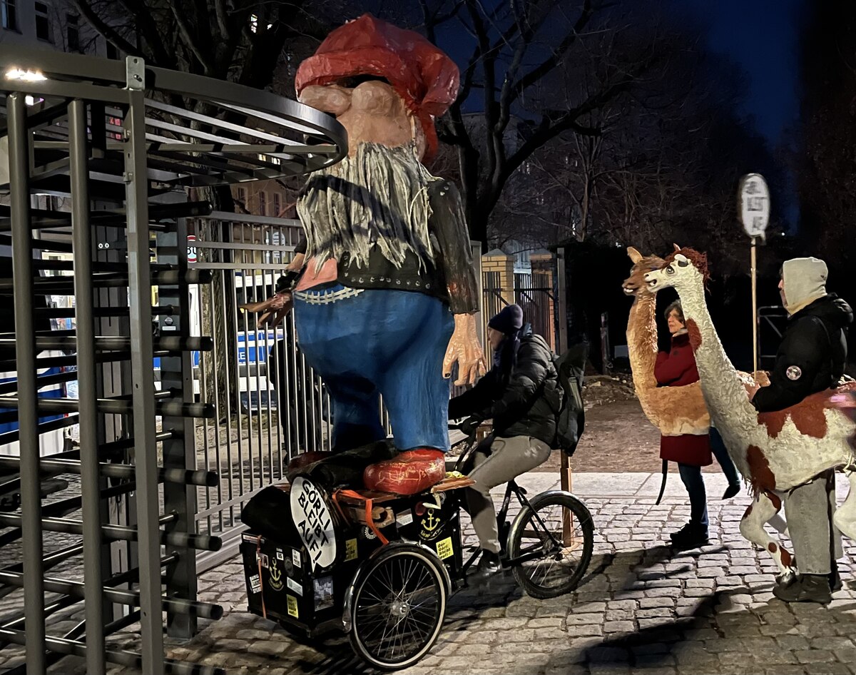 Derweil staut sich eine illustre Karawane am Ausgang Richtung Lübbener Straße: Der Wegner-Gartenzwerg passt nicht durch das Drehkreuz, das Tor ist bereits verriegelt. „Man soll doch hier raus. Könnt ihr mal aufschließen“, ruft der Zwerg den Polizist*innen auf der anderen Seite zu. Doch die haben keinen Schlüssel für das Fahrradschloss. „Der Görli geht nicht auf“, beklagt eines der Lamas. Auch der BSR-Mülleimer ist hier gestrandet. Der Görlitzer Park ist zu, und Kai Wegner findet den Ausgang nicht.