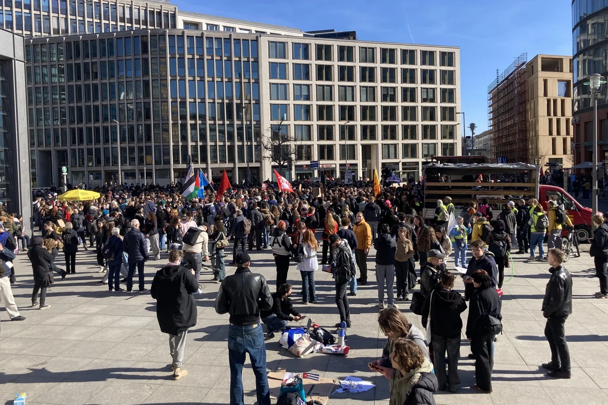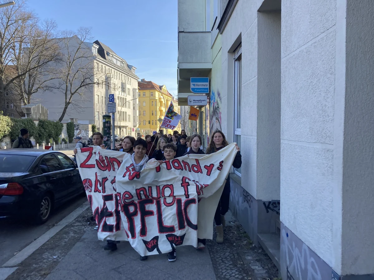 Die Stimmung auf der Zubringerdemo hält sich in Grenzen. Es wird viel geredet, Parolen und Gesänge gibt es zunächst nicht. Je mehr sich der Zug dem Potsdamer Platz nähert, Auftakt der berlinweiten Demo, ändert sich das. Die Schüler:innen kommen aus einer dunklen Straßenschlucht und werden von der strahlenden Sonne und Tausenden Mitdemonstrant*innen am Potsdamer Platz begrüßt. 10.000 werden es laut den Veranstaltern schließlich insgesamt sein. Aufgerufen hatte das Bündnis Schulstreik gegen Wehrpflicht.