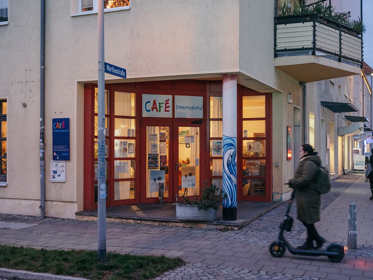 An einem Abend Ende Oktober sitzt Zyinab im Café 3K auf der Demminer Hauptstraße, die hier Clara-Zetkin-Straße heißt. Die Stoffvorhänge, einer in Dunkelrot und einer in Weiß, sind geschlossen. Am Fenster steht ein Tischkicker. Auf den runden Cafétischen aus dunklem Holz brennen Teelichter. An der Wand zieht sich eine gepolsterte Bank entlang. Im Nebenraum sitzen ukrainische Männer und Frauen um zusammengestellte Tische und bereiten sich auf ihre Deutschprüfung in der kommenden Woche vor.