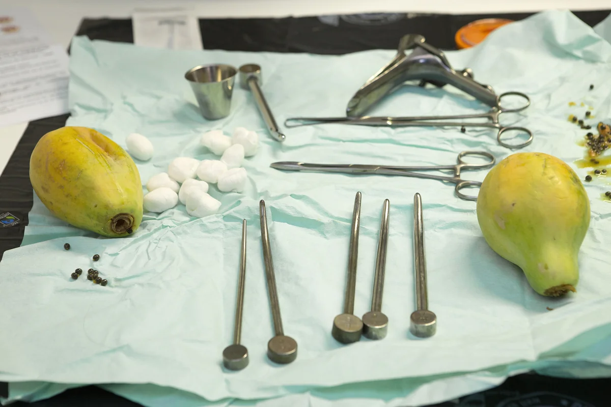 Wie ein Uterus soll die Papaya in dem medizinischen Workshop betrachtet werden. Zu Beginn muss die Papaya fixiert werden. Dafür greift eine filigran chirurgische Zange die Frucht in der Nähe des Stielansatzes bei der sogenannten Kelchgrube. Mit einem Kunststoffröhrchen durchsticht man sie dort und führt das Röhrchen durch das weiche Fruchtfleisch, bis es in der Mitte der Papaya auf Höhe der schleimigen, schwarzen Kerne zum Liegen kommt. Nun sollen die Kerne raus.