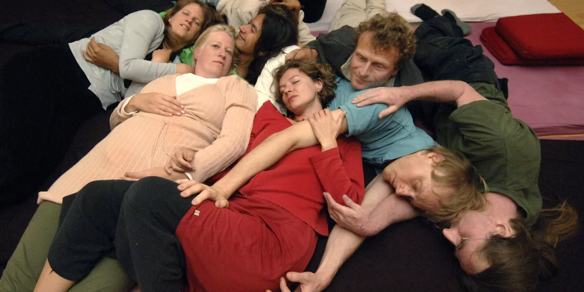 Die Kuschelzeit beginnt, auf die alle hier warten. Mir graut vor ihr. Erneut: Fluchtgedanken. Wir stellen uns in einen Kreis, legen Augenbinden an, fassen einander bei den Händen. Smita sorgt dafür, dass sich der Kreis zu einer Spirale formt und wir uns in der Mitte treffen. Ich spüre Körper, vor, neben, hinter mir. „Jetzt können eure Hände die Umgebung erforschen“, sagt Smita. Hände, die mich am Hintern berühren, die über die Brust streicheln. Es wird eng, es riecht nach Schweiß. Die ersten gleiten zu Boden. Ich schiebe die Augenbinde hoch. Kuschelknäuel. Ich klammere mich an Doris, freundliche Ausstrahlung. Oder hat sie mich ausgesucht?