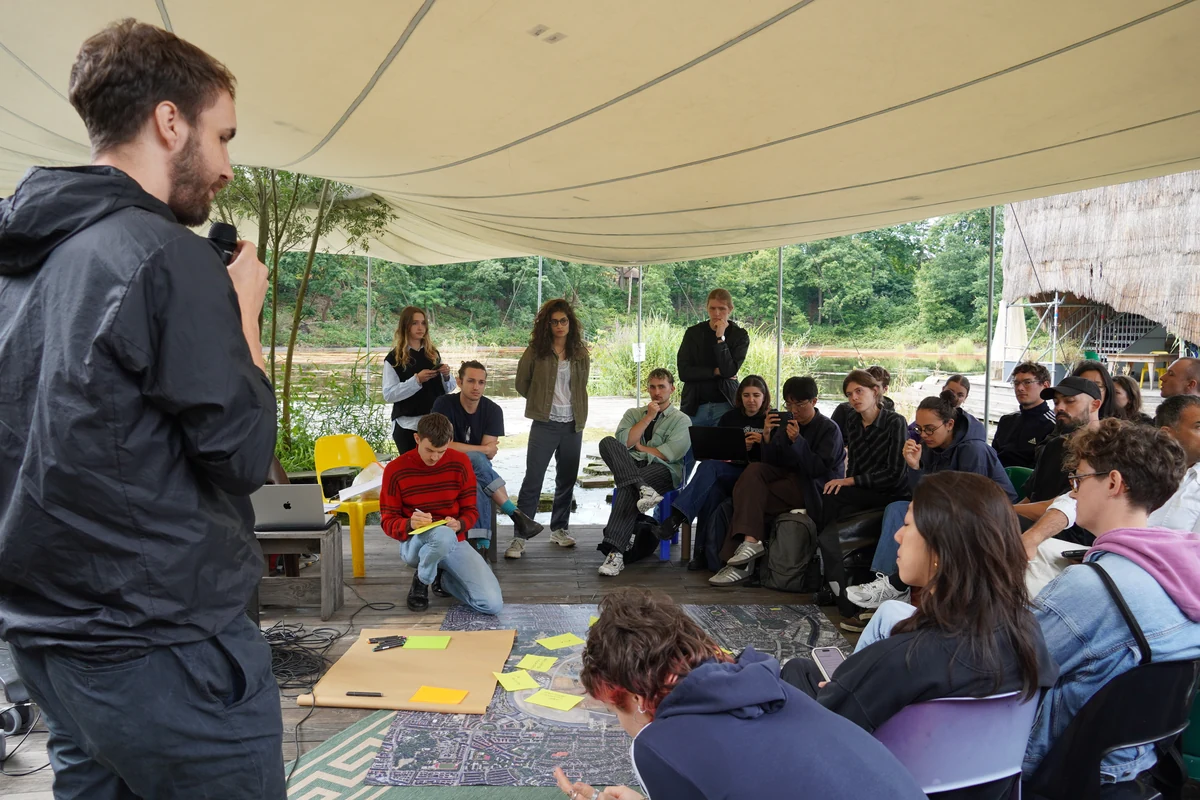 Sie wollen zeigen, dass es auch anders geht: Etwa 50 Studierende sitzen am Mittwochvormittag in bunten Stuhlreihen auf einem Holzpodest, ringsum ein Weiher, Schilf, lautstarkes Quaken der Frösche. Hier, in der „Floating University“ in Kreuzberg, stellen die angehenden Architekt*innen und Stadtplaner*innen ihre Konzepte für eine mögliche Zukunft des Tempelhofer Felds vor.