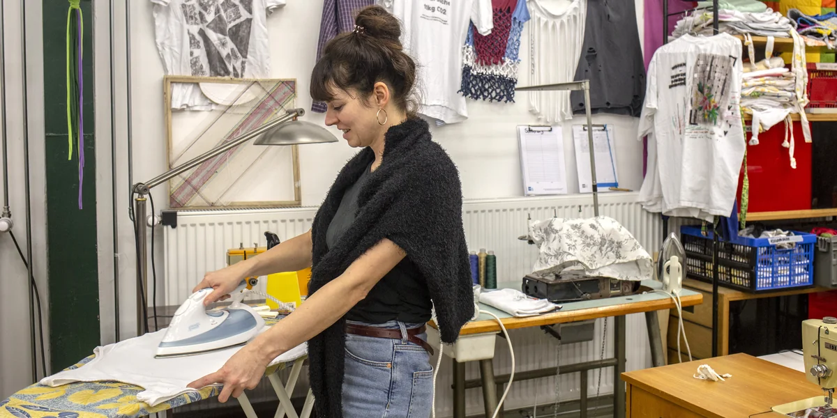 Tim van der Loo sitzt an einem etwa sechs Meter langen Tisch voller Nähmaschinen, Scheren, Druckfarben und zerschnittenen Hemden. Der studierte Textildesigner arbeitet mit den bis zu 25 Personen, die sich für einen Upcycling-Workshop im Textilhafen anmelden können. Van der Loo zeigt die bunten Boxershorts, die er mit Workshop-Teilnehmer*innen aus unbrauchbaren T-Shirts näht. „Davon geht etwa die Hälfte in die Kleiderkammer für Obdachlose, die andere Hälfte verkaufen wir zugunsten der Stadtmission“, erklärt der Designer.