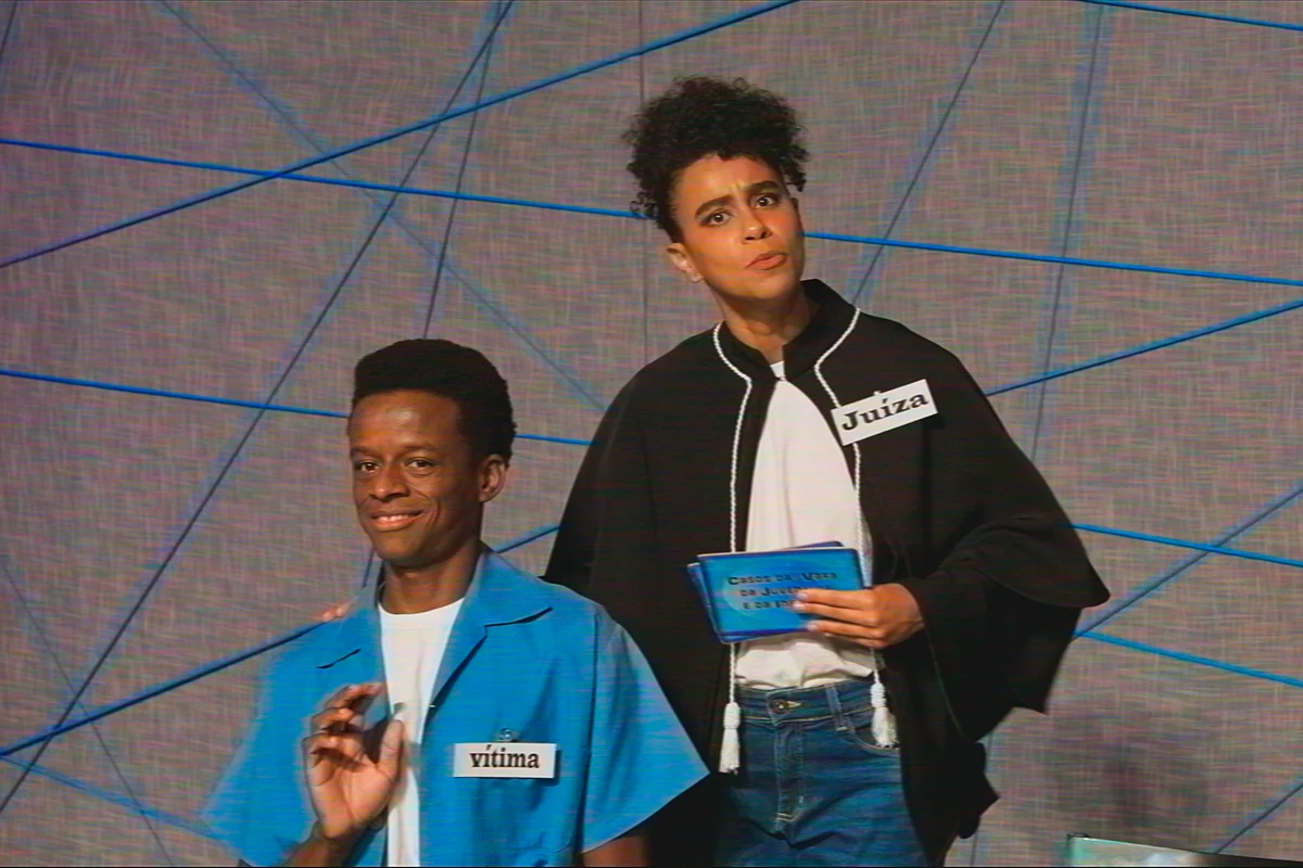 Dann beginnt der Prozess, der nun noch offensichtlicher als die vorherigen Szenen auf einer Theaterbühne stattfindet. Die Beteiligten sitzen um einen Tisch auf Regiestühlen mit Beschriftungen wie „Angeklagter“, „Richter“ und „Anwalt“. Immer wieder unterbricht die Stenografin die Verhandlung, um die vierte Wand zu durchbrechen. So sagt sie direkt in die Kamera: „60 Prozent der Insassen im Jugendgefängnis sind Schwarz. Dagegen sind es nur 12 Prozent der Richter_innen in Brasilien. Auch der Richter in diesem Prozess hat seine Zweifel an der Unschuld von 100.000, was er in einer abschließenden Musiknummer kurz vor der Urteilsverkündung zum Ausdruck bringt.