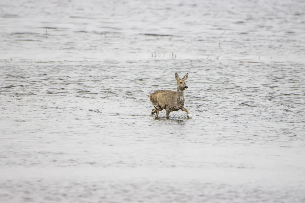 Im gefluteten Schwedter Polder gibt es schon jetzt kaum Stellen, an denen die Rehe auf trockenem Boden stehen können. Dabei ist die Schneeschmelze, die im Quellgebiet der Oder in Tschechien begonnen hat, noch gar nicht am Unterlauf des Flusses angekommen.