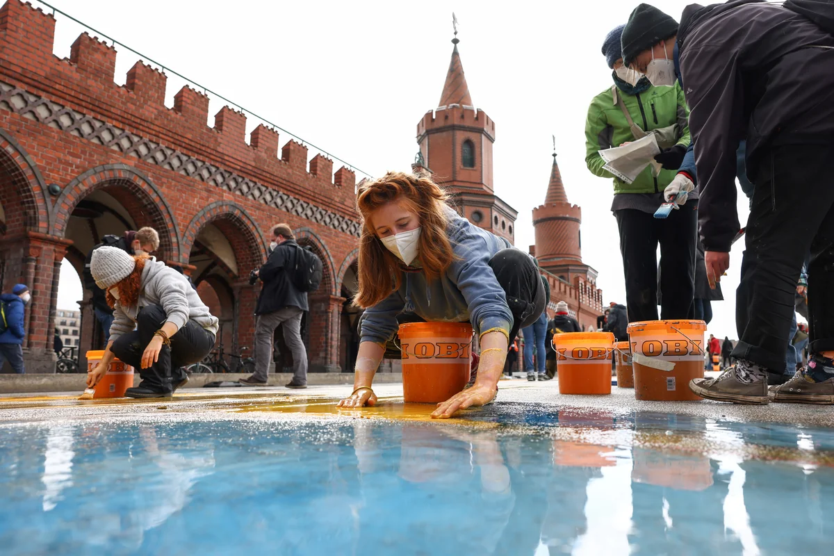 An der Berliner Oberbaumbrücke hatten die Vorbereitungen schon um sechs Uhr morgens begonnen: Mit Kreide wurden die Umrisse für eine riesige Straßenbemalung auf den Asphalt gezeichnet, die von kleineren Gruppen mit Farbe befüllt wurden. In der Mitte der Brücke war der Slogan „Another World Is Possible“ zu lesen, daneben befanden sich acht verschiedene Symbole mit FFF-Kernforderungen: Nötig sei ein Umdenken unter anderem in den Bereichen Mobilität, Energie, Ernährung und Gesundheit.