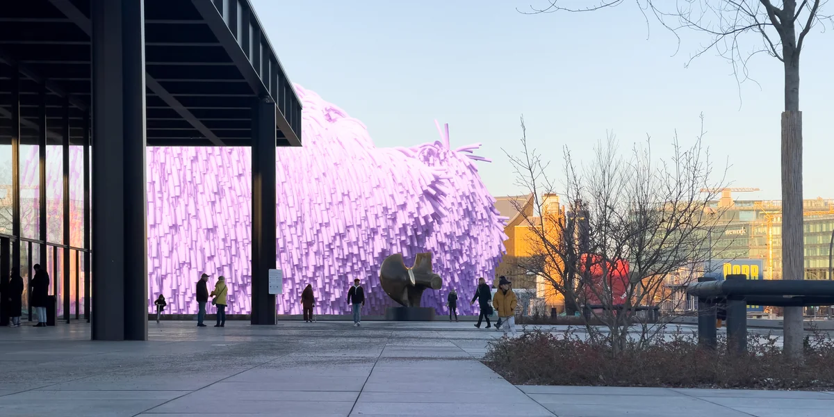 Hoppla, da fällt ein pinkfarbenes, kissenartiges Objekt aus dem Himmel über Berlin und landet am Kulturforum zwischen Nationalgalerie und Philharmonie, dann noch eins und dann noch eins. Sie sehen aus wie ein Wackelpudding mit Troddeln dran, schütteln sich noch ein bisschen zurecht, bleiben dann still liegen.