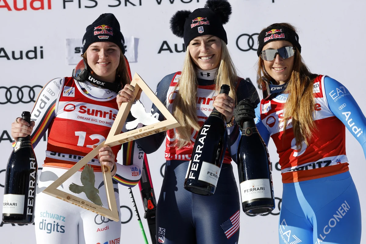 Alleine ganz oben auf dem Podest zu landen, ist für die junge Aicher noch etwas Besonderes. Aber erst recht, wenn links und rechts davon zwei der ganz Großen in der Abfahrt stehen, Weltmeisterin und Olympiasiegerin Lindsey Vonn als Zweite und Sofia Goggia, Gewinnerin der Goldmedaille bei den Winterspielen in Pyeongchang 2018, als Dritte. Die eine hatte am Tag zuvor bei ihrem 83. Weltcup-Sieg mit 41 Geschichte geschrieben, die andere möchte das im kommenden Februar mit einem weiteren Olympiasieg in ihrer Heimat Italien.