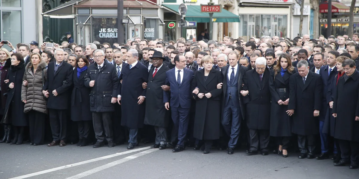 Slavoj Žižek : Das Pathos der umfassenden Solidarität, das sich nach den Pariser Morden explosionsartig ausbreitete, endete am 11. Januar im heuchlerischen Spektakel der Politiker aus der ganzen Welt, die sich an den Händen hielten. Die wahre Charlie-Hebdo-Geste wäre gewesen, auf dem Titel der Ausgabe von letztem Mittwoch eine Karikatur zu bringen, die sich spöttisch zeigt gegenüber diesem Ereignis: Netanjahu und Abbas oder Lawrow und Cameron und andere Paare, die sich leidenschaftlich umarmen und küssen, während sie hinter ihren Rücken die Messer wetzen.