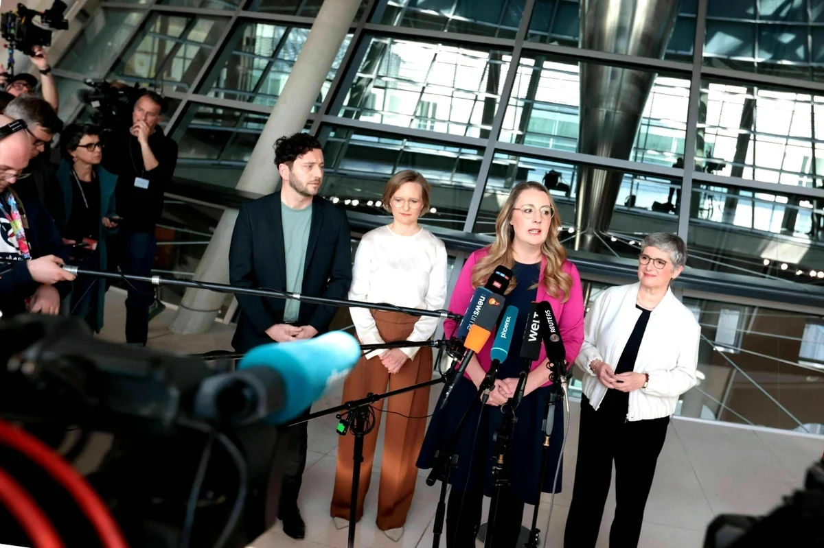 Es ist Montag, zwei Wochen nach der Wahl um Punkt zwölf Uhr, als die Grünen in der Opposition ankommen. Die Spitzen von Partei und Fraktion haben zu einer Pressekonferenz geladen, um zu verkünden, dass sie dem Vorschlag von Union und SPD für ein Sondervermögen für Investitionen und eine Reform der Schuldenbremse nur fürs Militärische nicht zustimmen werden. „Wir stehen nicht dafür bereit, die Steuergeschenke von Union und SPD zu finanzieren“, sagte die Parteichefin Franziska Brantner.