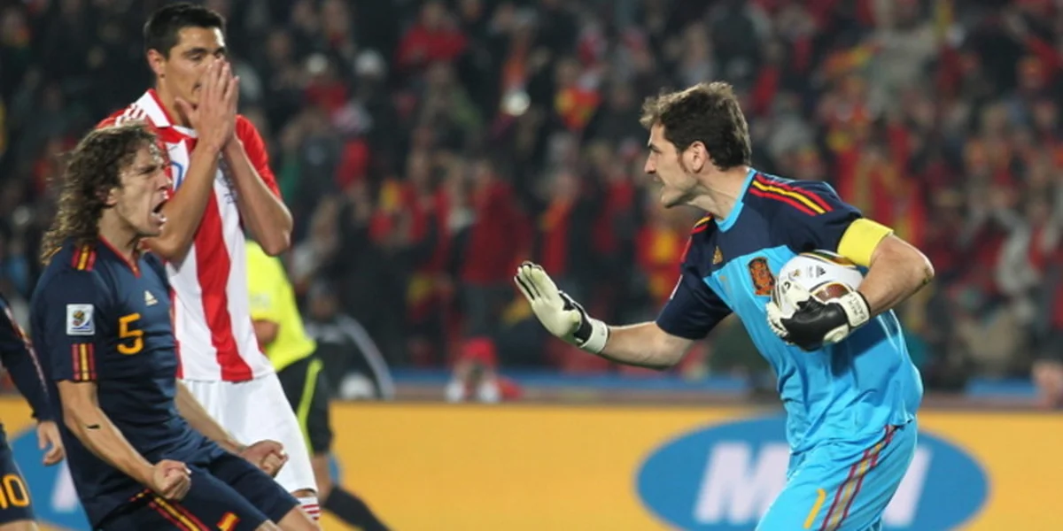In der zweiten Hälfte zunächst das gleiche Bild. Bis zur 57. Minute. Dann wurde es kurios, furios, dramatisch: Piqué zerrt seinen Gegenspieler Cardozo mit aller Macht zu Boden und Schiedsrichter Batres zeigt auf den Punkt: Elfmeter für Paraguay. Der Gefoulte tritt an, Casillas hält. Gegen Japan hatte Cardozo noch den entscheidenden Strafstoß verwandelt, diesmal scheiterte er kümmerlich. Der direkte Gegenzug der Spanier und jetzt ist es Verteidiger Alcaraz, der David Villa im Strafraum von Paraguay von den Beinen holt. Wieder Elfmeter, diesmal für Spanien. Xabi Alonso legt sich den Ball zurecht, schießt, trifft, jubelt - und wird zurückgepfiffen. Der Strafstoß muss wiederholt weden und diesmal hält Paraguays Torwart Villar. Dass er im Nachsetzen den eingewechselten Fabregas klar von den Beinen holt und es demnach noch einen zweiten Elfmeter für Spanien hätte geben müssen, geht in der Aufregung vollkommen unter.