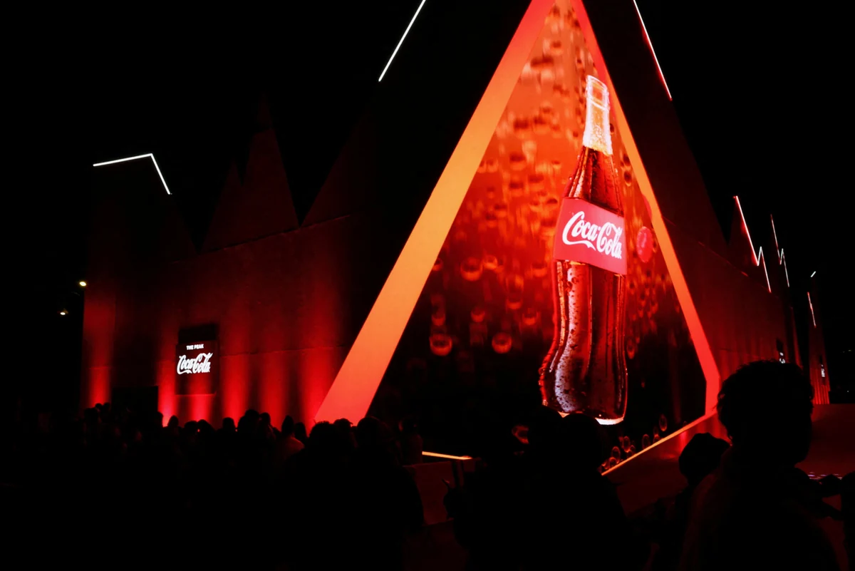 Später lese ich nach, dass man drinnen mit einer Seilbahngondel fahren kann, die aber nicht wirklich fährt, dass man durch einen verspiegelten Tunnel gehen soll, in dem Jubellaute von Fans zu hören sind sowie das Geräusch, das entsteht, wenn eine Colaflasche geöffnet wird. Man wird dann wohl noch fotografiert, aus einer colafarbenen Wand wachsen Berge und am Ende soll man klatschen und jubeln und sieht sich selbst als Fan bei einem Wettkampf.