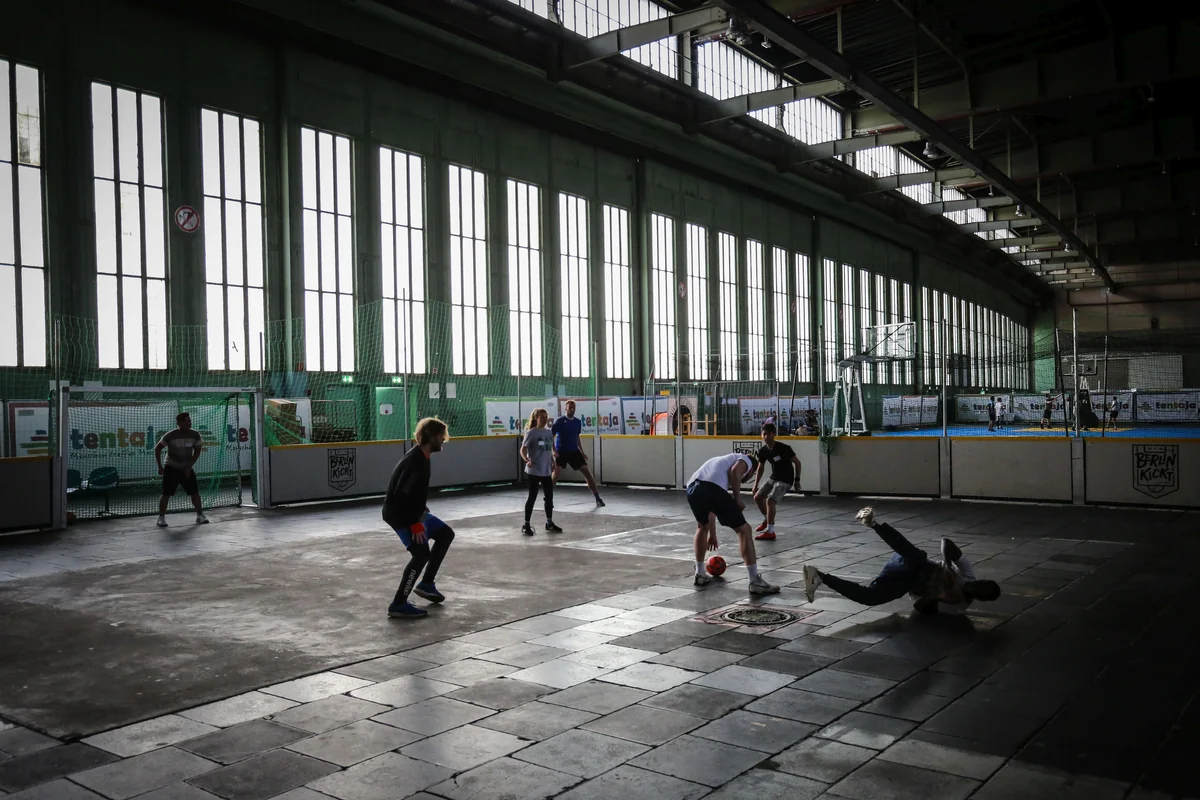 Auf dem Indoor-Sportplatz Tentaja im ehemaligen Flughafen Tempelhof trainieren neben Alteingesessenen vor allem Geflüchtete.