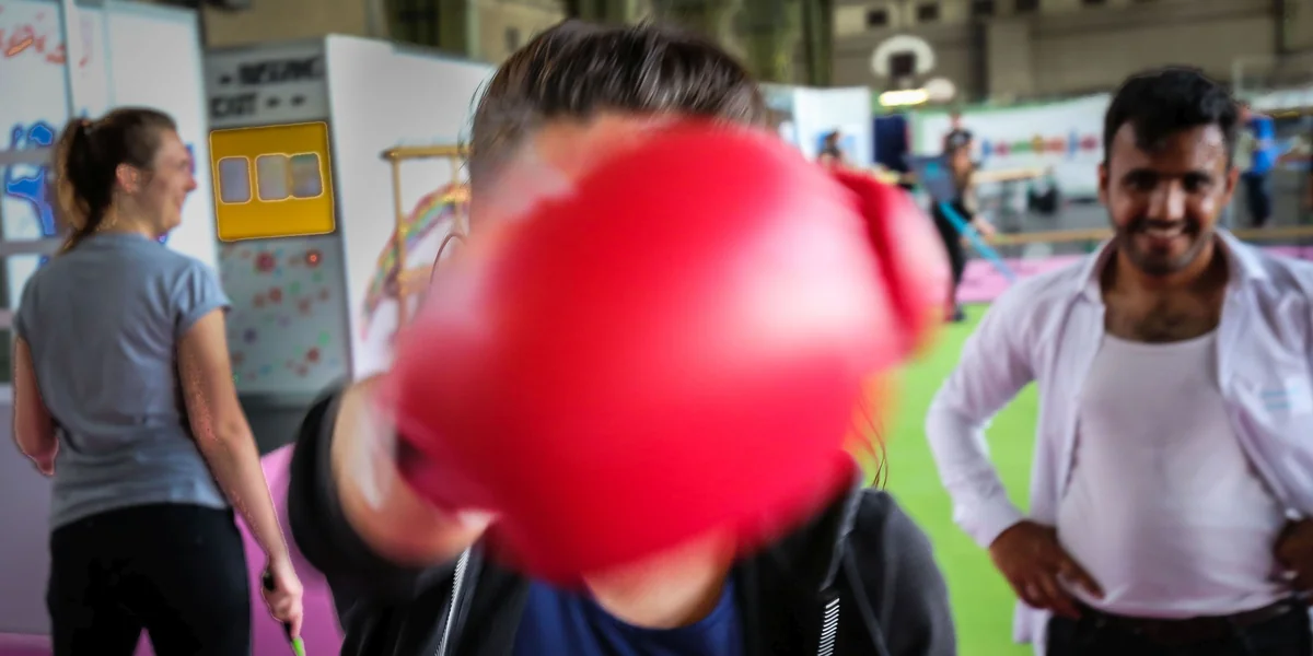 Tentaja heißt der Ort in Hangar 5 mit Volleyballnetz, Basketballkörben, Kicker, Boxring sogar einer Baseball-Anlage. Tentaja kommt vom französischen „tente“ für Zelt, und Chefin Isabell Seidenstücker sagt, dass dieser Ort längst überfällig gewesen sei. Schon vor der Eröffnung im Herbst 2017 gab es hier eine Indoor-Spielfläche für die Geflüchteten in der Notunterkunft, jetzt ist sie täglich kostenlos für alle geöffnet, eine Begegnungsfläche von 10 Uhr bis 21.30 Uhr.