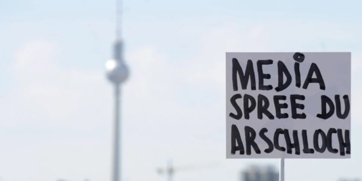 Das Gelände, auf dem eine ehemalige Seifenfabrik steht, ist ein weiterer Mosaikstein im umstrittenen Bauprojekt namens Mediaspree. Dessen Inhalt: Das Spreeufer zwischen Kreuzberg, Friedrichshain und einer Ecke von Mitte soll mit Luxuswohnungen, Hotels und Bürogebäuden bebaut werden. Daher bleibt die Auktion nicht unbeobachtet: Im Saal befinden sich Aktivisten der Initiative „Mediaspree entern“, vor der Tür des Auktionsortes findet eine Kundgebung mit einem Dutzend Teilnehmern statt. An eine Baustellenabgrenzung haben sie ein Transparent mit der Aufschrift „Privatisierung stoppen, Investoren einseifen“ gehängt. Und doch wissen sie, dass ihr Protest hier höchstens Symbolwert hat. „Wir wollen den Investoren zeigen, dass wir sie beobachten“, sagt Florian von der Initiative „Mediaspree entern“. „Sie sollen nicht glauben, dass sie hier ein leichtes Spiel haben.“