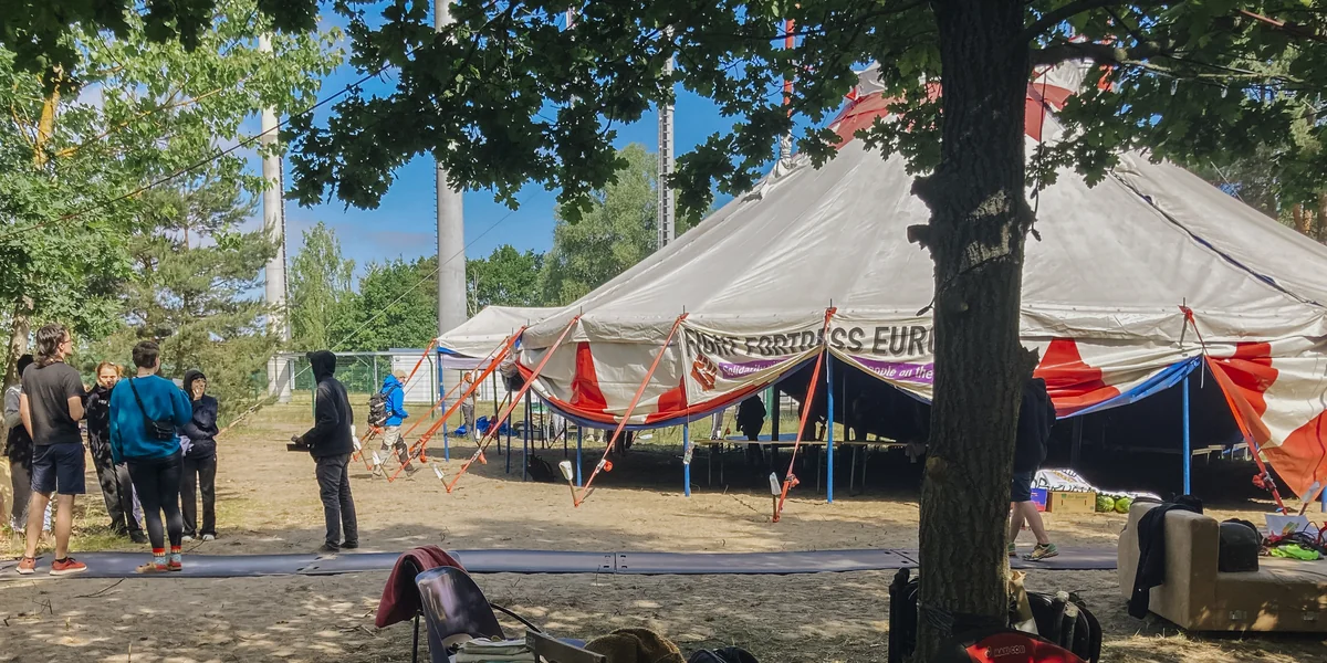 Bis kommenden Dienstag sollen nun 500 bis 600 Aktivist*innen auf Einladung der Initiative „Abschiebezentrum BER verhindern“ in Sichtweite des Flughafens tagen. Es geht gegen das geplante Ein- und Ausreisezentrum, aber auch generell gegen Abschiebungen und für offene Grenzen. Es wird viel diskutiert und genetzwerkt werden, am Montag (Start 13.30 Uhr am Camp) gibt es eine Demo zu den bestehenden und geplanten Abschiebegebäuden.
