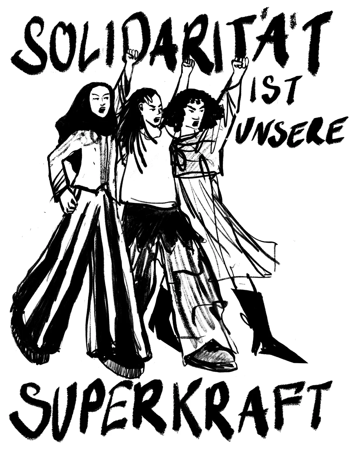 Und zu guter Letzt: Mit einer Siebdruckmaschine kann man sich die unten abgebildete Illustration auf ein Shirt drucken lassen – einfach ein helles Shirt mitbringen und Solidarität nach außen tragen!