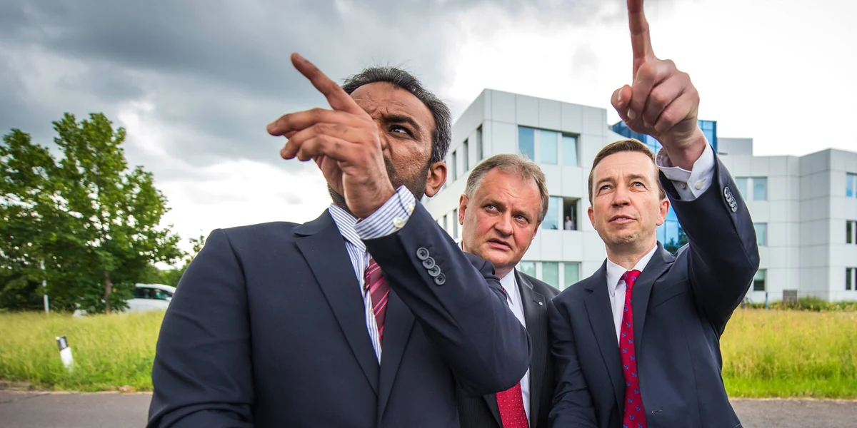 An diesem Morgen im Juni hat Mohammad Suleman Malik die Pläne eingepackt, die der Architekt gezeichnet hat: die Draufsicht, die Nordostsicht, das Minarett. Der Sprecher der Ahmadiyya-Muslim-Jamaat-Gemeinde Thüringen führt einen Tross an. Sie gehen durch eine Sackgasse im Industriegebiet von Erfurt-Marbach, rechts das THW, links der TÜV, ringsum Felder. An einem Schlagbaum am Ende der Straße stoppen sie. Malik faltet die Pläne auseinander und hält sie seinen beiden Gästen hin. Alle drei Männer tragen anthrazitfarbenen Anzug, helles Hemd, rote Krawatte, sie stehen da wie Schnellrestaurantmanager, die eine neue Filiale einweihen, aber vor ihnen ist bloß eine leere Wiese, grob gemäht, am Ende ein paar Büsche, dahinter das Rauschen der Schnellstraße.