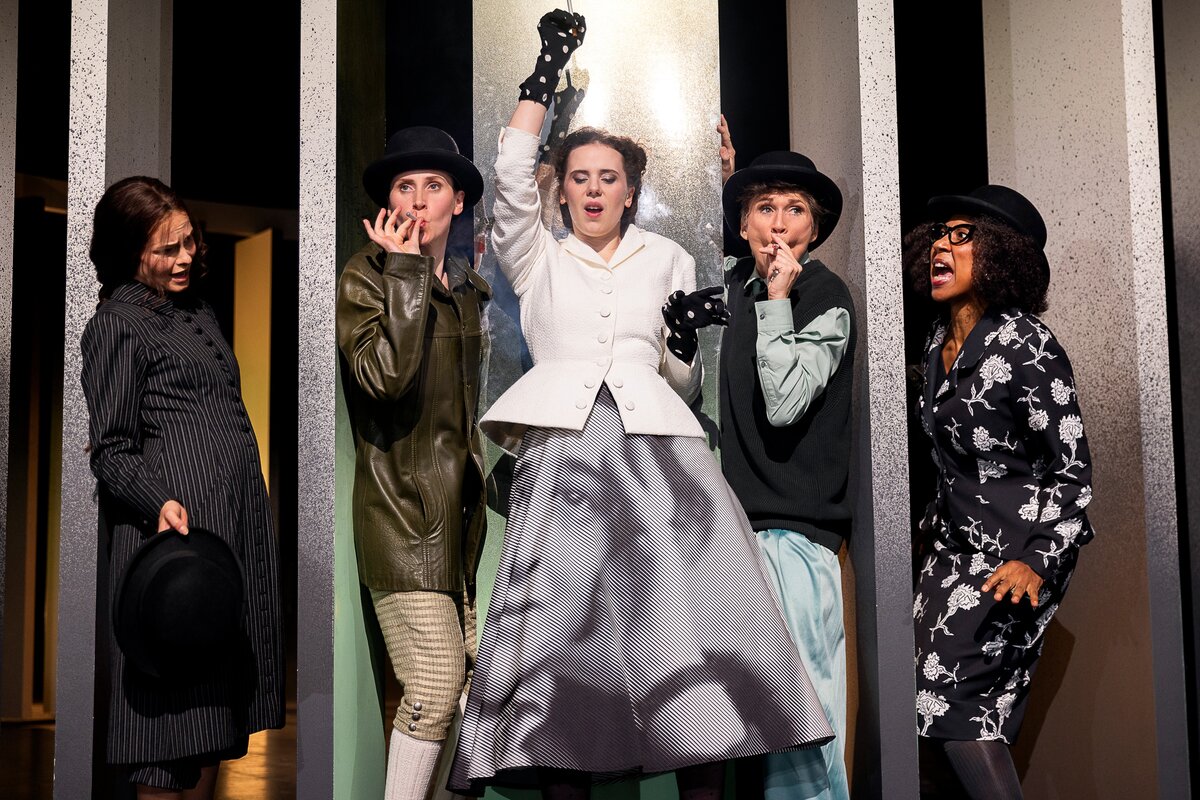 An den Schauspieler*innen lag es also nicht, dass der Abend im Deutschen Theater nicht funktionierte. Was auf der minimalistisch ausgestatteten Bühne unter Zuhilfenahme unzähliger Theaterzigaretten aufgeführt wurde, war eine aus vielen Mosaikstücken zusammengesetzte Geschichtsstunde, die leider von keinem größeren künstlerischen Einfall zusammen gehalten wurde. Bis auf ein paar Brecht-Weill-artige Choreografien, die zwischenzeitlich für Schwung sorgten, floss der Abend dröge dahin.