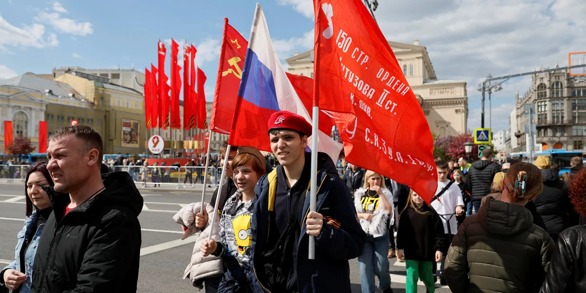 Viele Familien flanieren im Stadtzentrum, manche Kinder tragen olivgrüne Uniformen, halten Spielzeuggewehre im Arm. „Da wächst ein Kämpfer heran“, sagt so mancher. Die Menschen schwenken russische, manche auch sowjetische Fahnen. Am Ende der 45-minütigen Parade ziehen sie in die Moskauer Parks, es gibt Essen aus der Feldküche, gut ein Dutzend Feuerwerke am Abend.