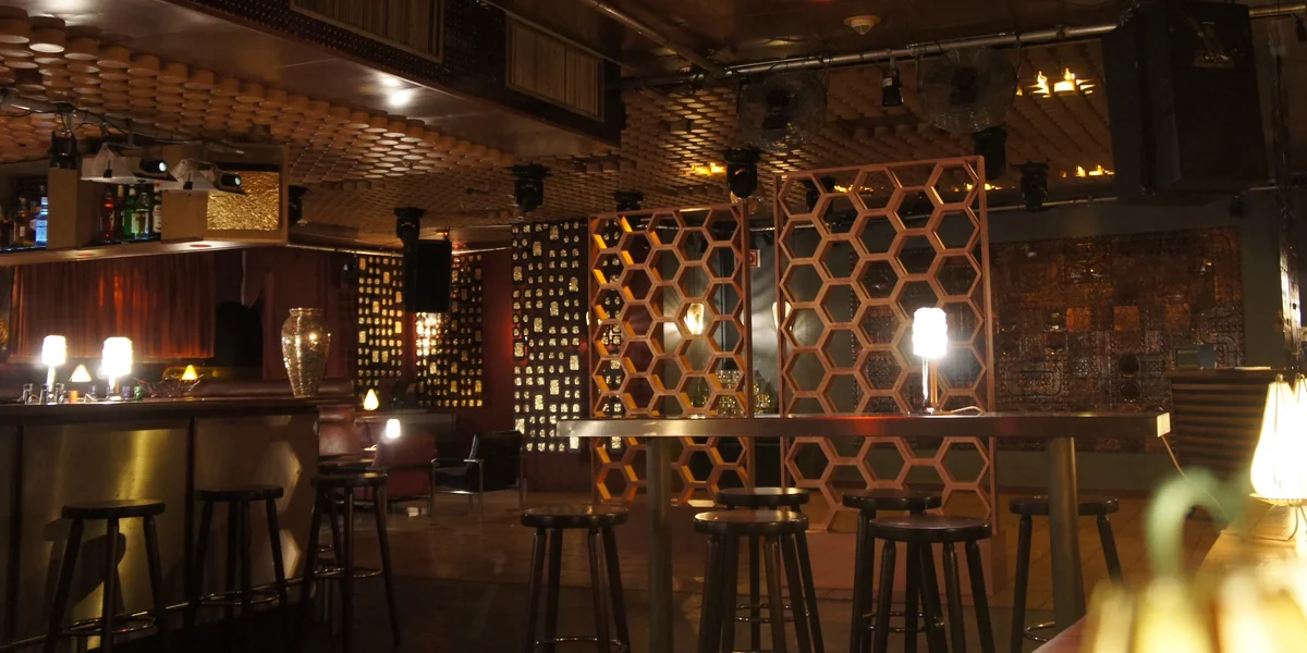 „Hier im Club befinden sich noch originale Einrichtungsgegenstände“, erzählt Keijzer: Das Bronzemosaik hinter der Tanzfläche stammt aus der Zeit vor dem Mauerbau, die verkleidete Decke ist typisch für die 60er Jahre, und auch der runde Tresen mitten im Raum hat seine damalige Form behalten.