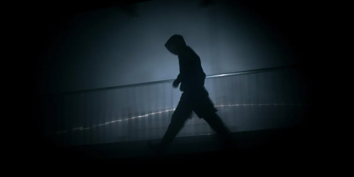 Tiran im Kapuzenshirt wird erst nur im Licht seiner Taschenlampe sichtbar, suchend die leeren Stufen der Zuschauertribüne auf und ab rennend. So sieht Panik aus.