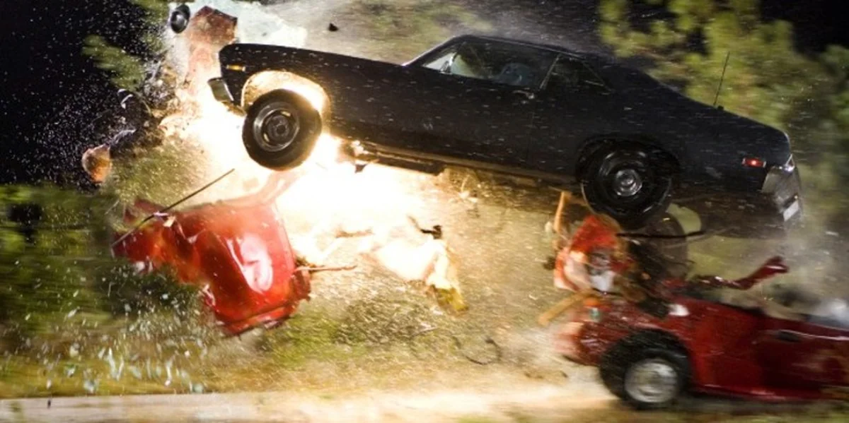 Vier Frauen, eine Posse, keine Jungs und ein schöner, gemeinsamer Flow. Doch im nassen Glas der Heckscheibe bricht sich rotes Licht wie ein Vorbote dessen, was da kommen wird. Denn auch diesmal bringt Tarantino Stuntman Mike ins Spiel. Eine unfaire Konfrontation, ein rotes Auto gegen ein schwarzes Auto, vier Frauen gegen einen Mann, 200 Stundenkilometer gegen die nächtliche Versunkenheit - es ist eine Zäsur, die die Bezeichnung spektakulär verdient.